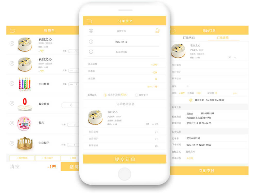 蛋糕订购,购物车,优惠卷,提醒系统,会员中心,商品展示(商品详情,推荐及商品评价),会员卡系统(充值,支付),商家手机处理订单(接单、送货),短信、模版消息,订单动态,订单自动打印,主题切换