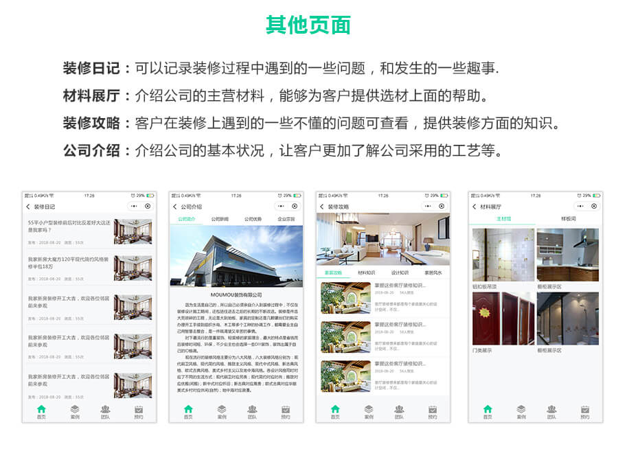 解决装修公司微信端快速传播营销的功能。公司设置,促销设置,小区设置,案例设置,团队设置,电话设置,可用VR展示,支持查看工地进度。